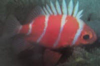 Identification: Bright red rounded body with 5 narrow white bars, white dorsal spines; huge eye.