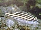 Identification: Eight alternating white to light blue and dark gray stripes on upper body, bottom stripe connected with slanting dark lines; small dark spot on upper tail base.