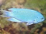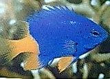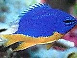 Identification: Brilliant blue over most of head and body, yellow lower body, ventral, anal and tail fins. Similar Goldtail Demoiselle distinguished by blue belly.