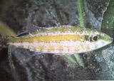 Identification: Small elongate body; mottled shades of green to brown mixed with white; wide darkish mid-lateral stripe, pale spots on fins.