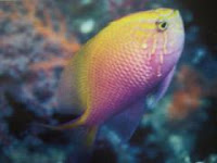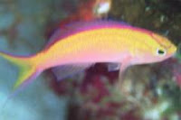 Identification: Male - Yellow with purple dorsal fin and borders on tail; purple line markings on head. Reddish with white dorsal fin and tail borders in Indian Ocean.