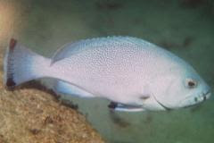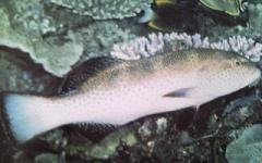 Identification: Whitish to pale gray with numerous small dark-edged blue spots on head, body and fins; frequently with 4-5 dark blotches forming saddles on back.