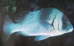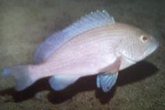 Identification: Pale gray to reddish gray; small dark spots on head, dark wavy lines and spots on body, fins bluish on smaller fish.