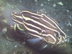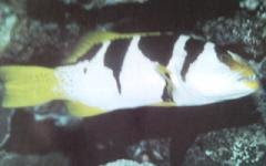 Identification: Pale Variation - Whitish with 4 black saddles on body and black band above eye, fins yellow. Generally smaller than the dark form and is possibly restricted to juveniles and females.