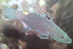 Identification: Long slender body and elongate pointed head; dark bluish gray with black speckling; yellow spot on tail base, blue-rimmed black blotches on dorsal and ventral fins.