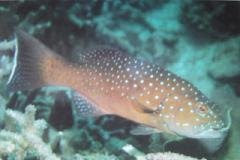 Identification: Blotchy brown with white spots on body. One of the larger hawkfishes.