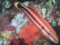 Identification: Red to yellow upper head and back, pale below; numerous pale thin stripes run from head to tail, large diagonal black area across tail base; ventral fin and border of anal fin black.
