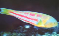 Identification: TP - Purple head with green bands, green upper body, yellow below; pair of purple wavy-edged stripes on upper body, purple tail borders.