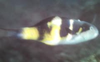 Identification: TP/IP - Large black patch from snout to behind pectoral fin followed by 2 wide black bars with white or yellow between, yellow on tail base; underside of head and forebelly white to green.