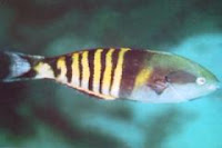Identification: TP - Blue-green head and forebody with alternating yellow and blackish bars behind; dark patch behind eye.