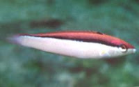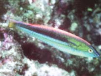 Identification: TP - Green to bluish; broad blackish stripe on upper side and narrower blue stripe immediately below; bright blue snout followed by salmon stripe down back.